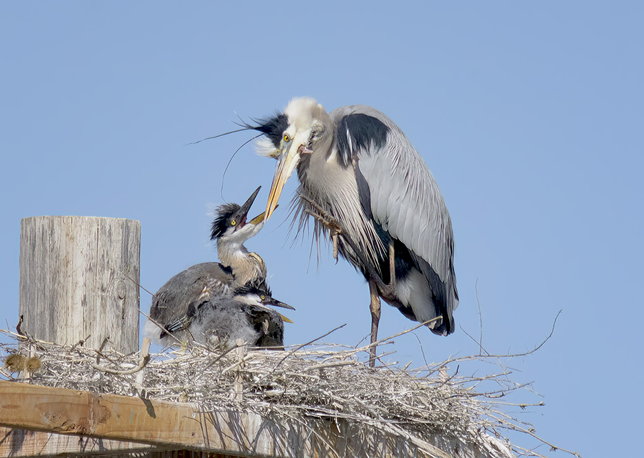Raising Great Blue Herons' chicks is incredibly difficult. They can be brutal toward their parents and often attack them while they are fed. The chicks also can be violent towards their siblings hurting them in a fight for food.